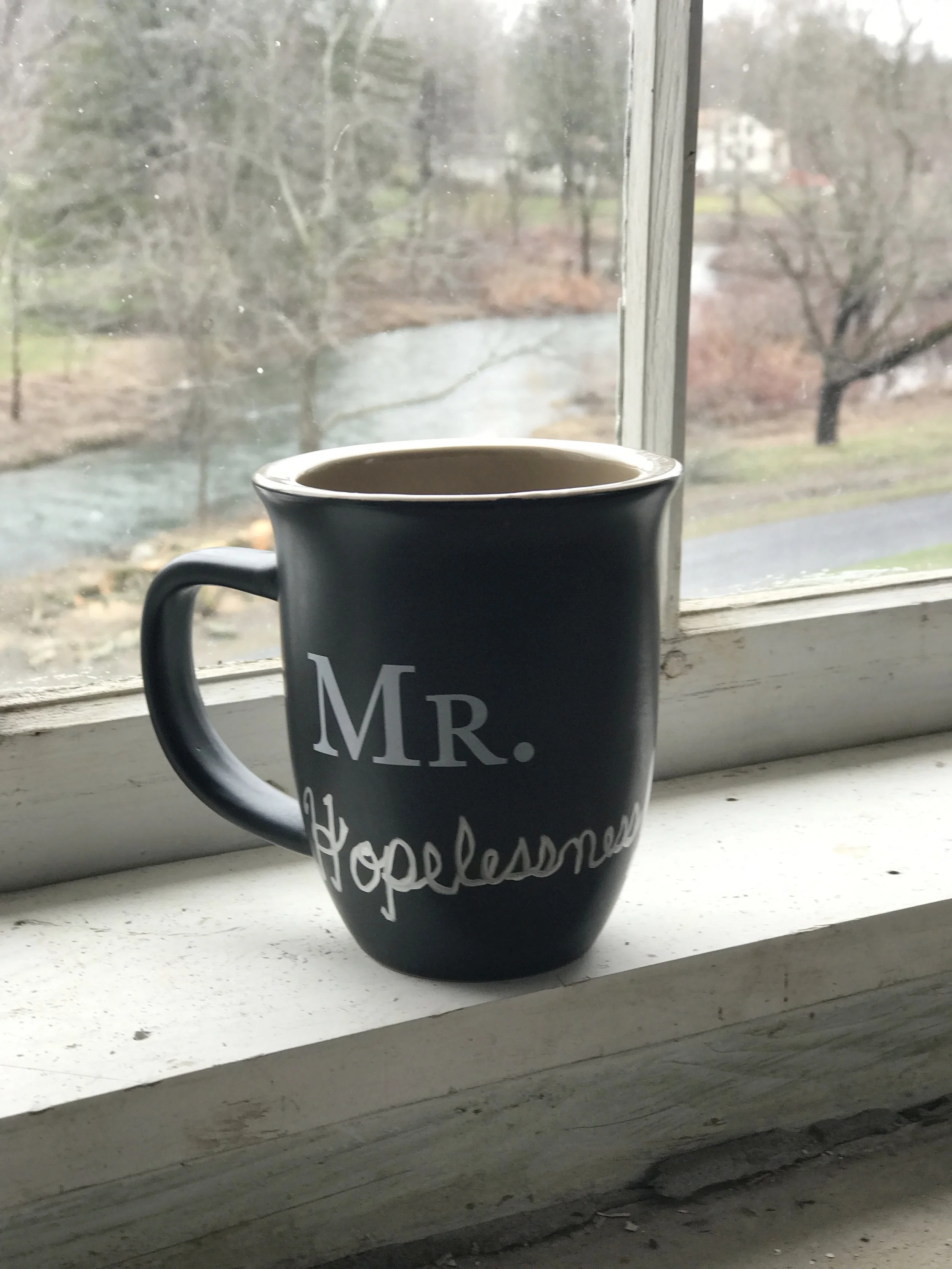 Funny enough, I purchased this mug at a T.J. Maxx in Ocean City about 15 minutes after writing this blog. I only looked at the other side that says Hope, Love and Faith. I didn't notice that it so boldly said MR. on the backside! I was so disappointed. I opened up my blog to edit and then it appeared again. Mr. Hopelessness. Well how fitting could that be. "I'll fix this I thought," I just took out my pen, fixed the mug and then sat down and had a cup of coffee with him. Then I happily put him back in the cupboard where he can stay for a while! Perfect! Now I love the mug.